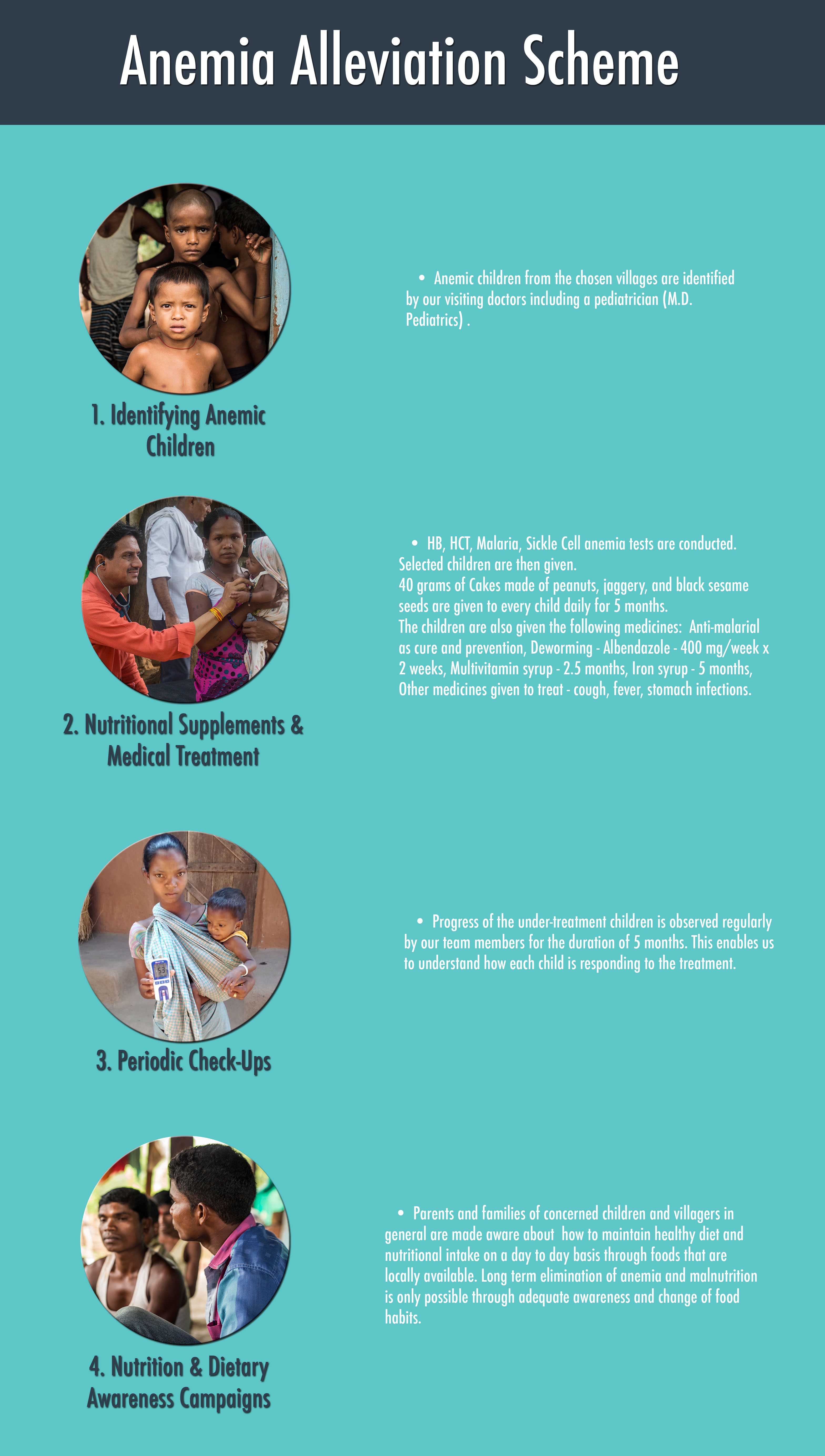 2. Anemia Alleviation Scheme : To provide nutritional supplements and medical attention to affected children to eliminate malnutrition, anemia at an early age and prevent related illnesses that develop over time.