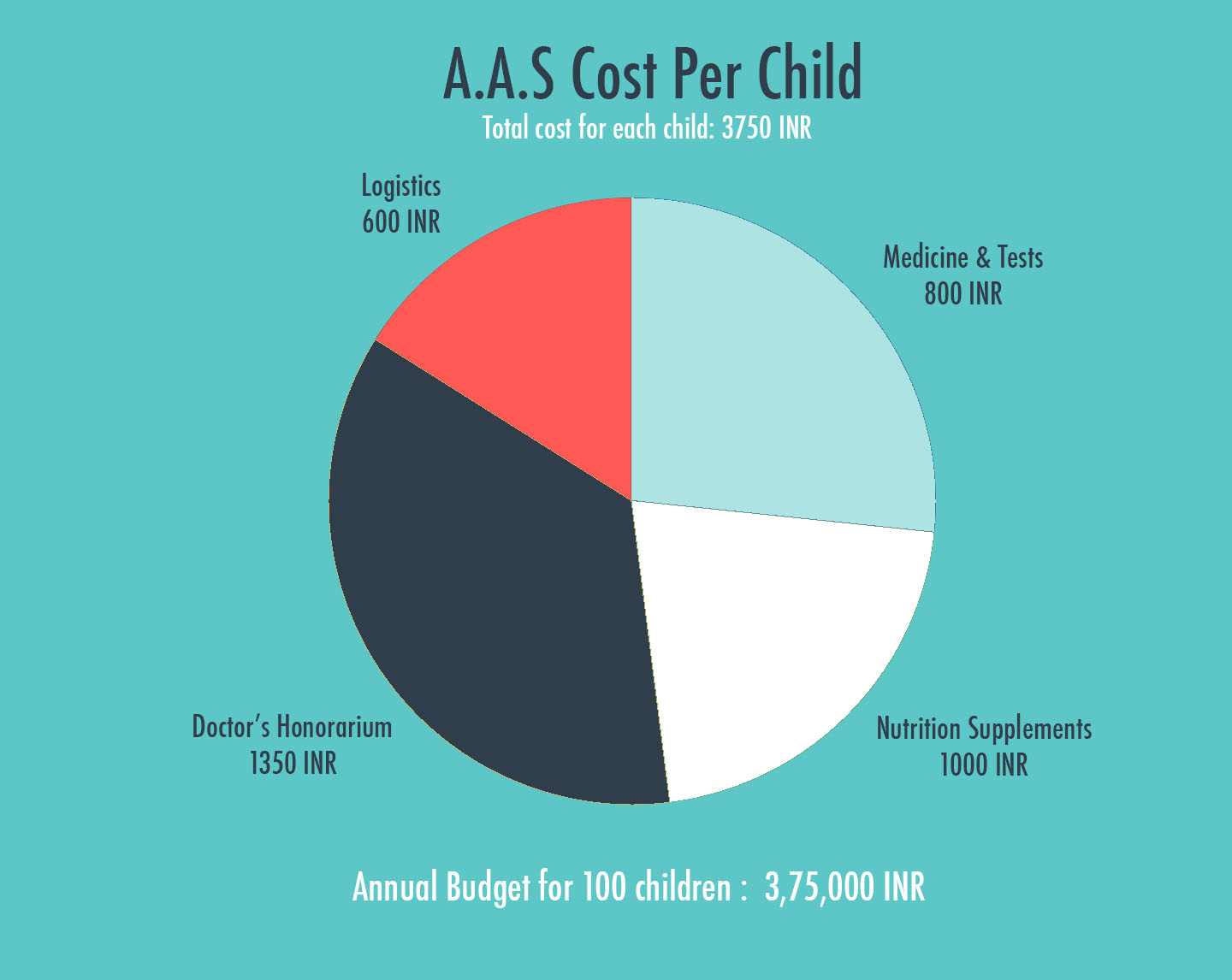 The cost per child is 3,750 INR and thus each batch of 50 students needs a budget amount of 1,87,500 INR. Hence the annual budget for 2 batches is 3,75,000 INR. Breakdown of individual cost is as shown below.