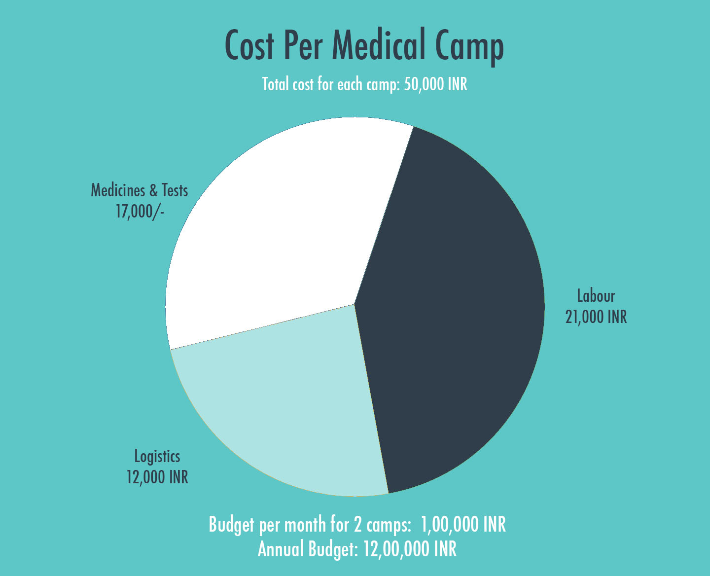 In order to conduct 2 medical camps every month at the cost of 50,000 INR per camp, the total annual budget is 12,00,000 INR per year.