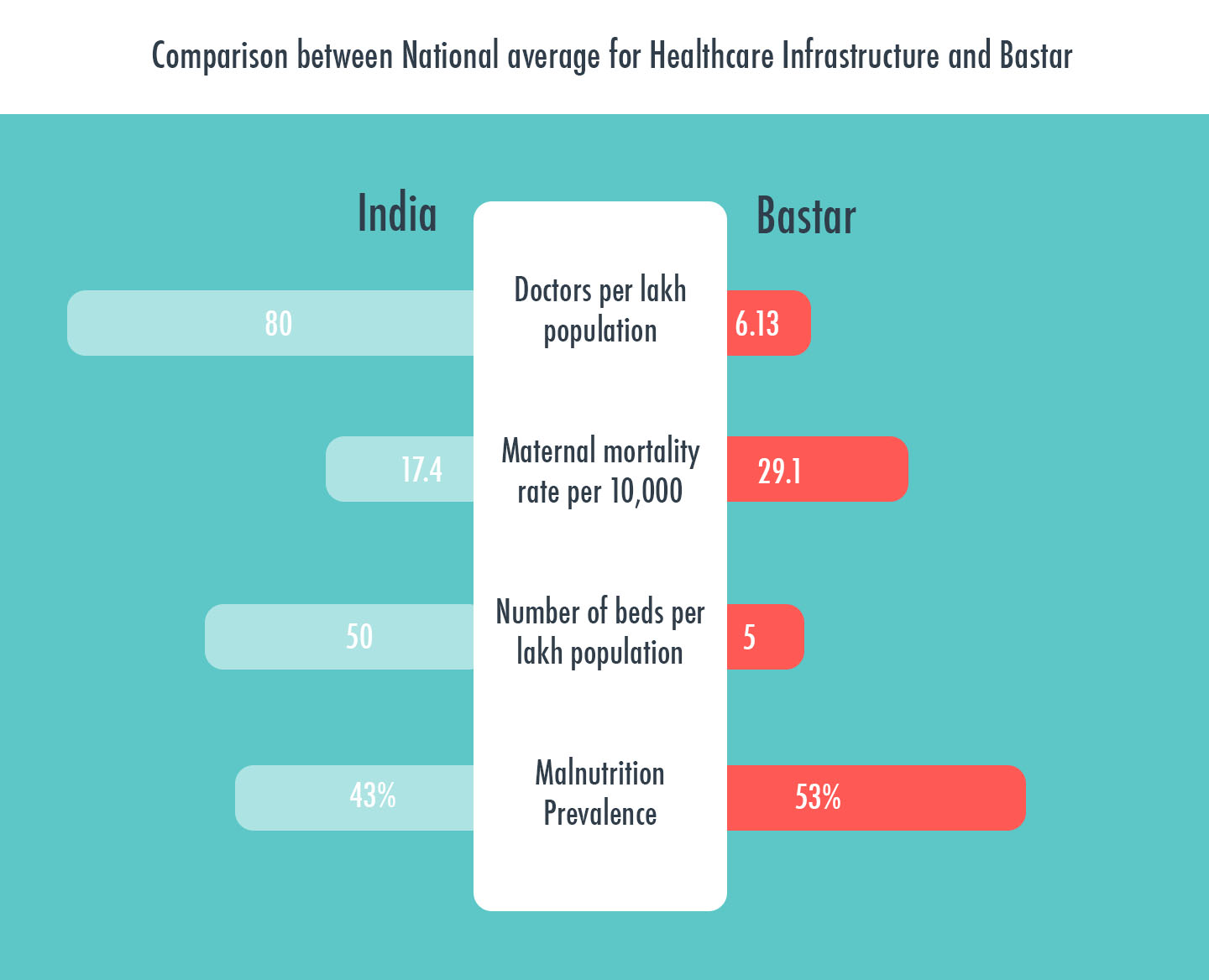 This comparative look at some of the health-related parameters of Bastar in contrast with the national average enables us to understand the grim reality of the healthcare situation in the region..