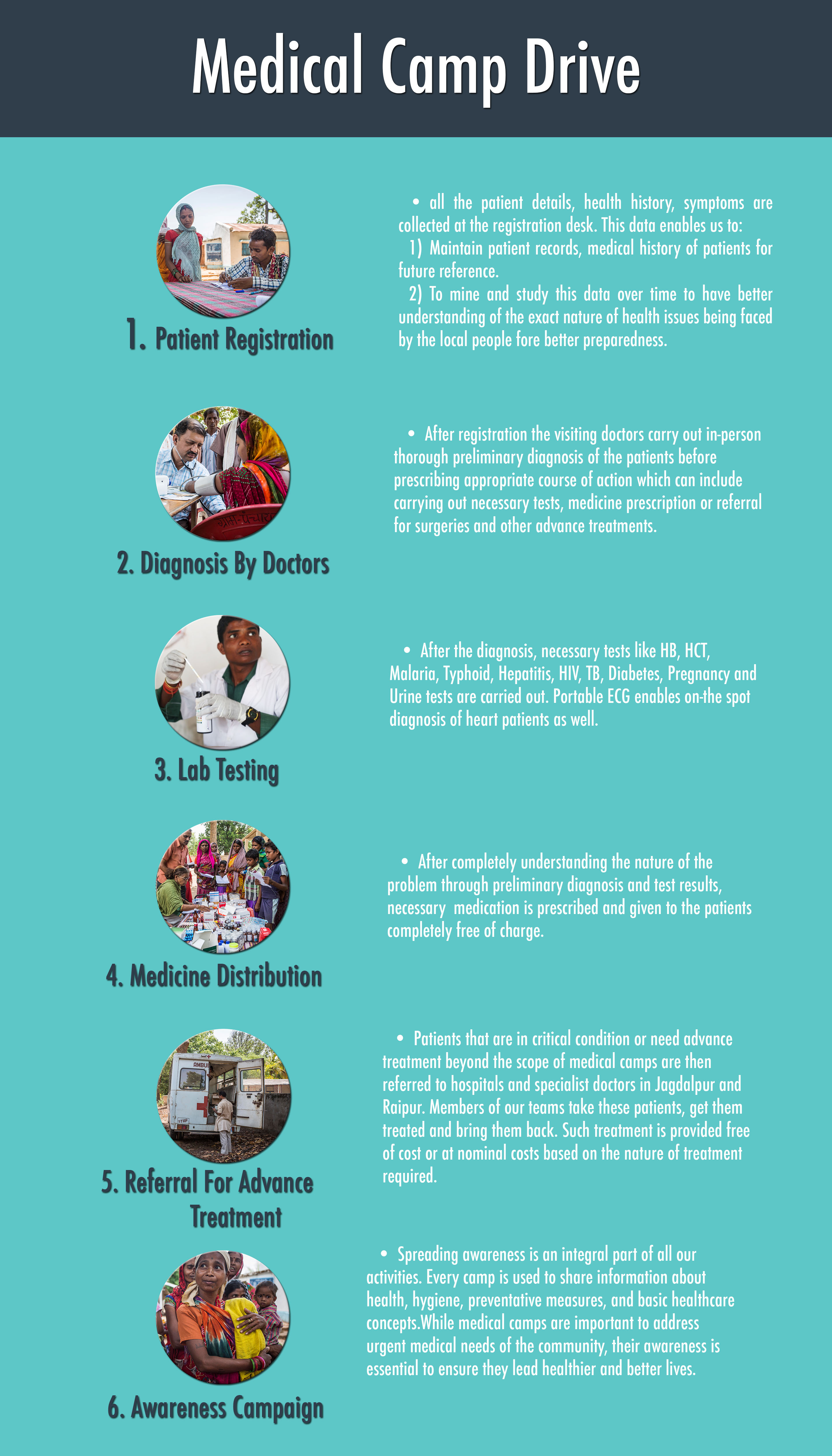 Since July 2017, 2 medical camps have been conducted every month in different villages of Bastar region. Through these camps we have been able to diagnose and treat over 5,000 patients who have little or no access to public or private healthcare. Every camp consists of 6 key steps as shown below: