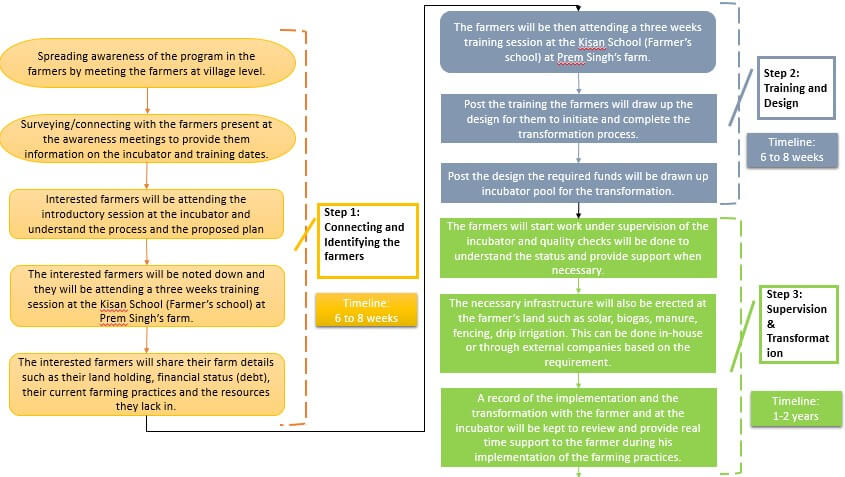 - Step 3: Supervision & Transformation- The farmer’s transformation to organic farming will be supervised by the incubator’s employees and Prem Singh which will be evaluated periodically and they will be provided with advice in the areas they are lacking.