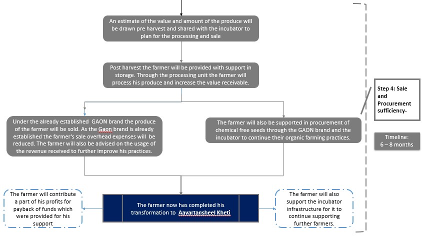- Step 4: Sale and Procurement sufficiency- The farmers will be provided with a sale outlet for their produce as well as support in seeds for growing their produce through the GAON brand and the incubator. Through the farmer will be eventually made self-sufficient wherein his dependency will be completely eliminated and his produce is more in demand due to its quality.