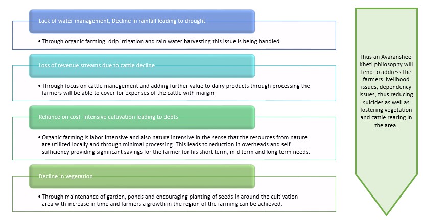 - • This model of farming creates a balance and addresses the problem of depleting ground water, tree cover, stray cattle management while providing a sustainable and profitable mode of doing agriculture hence reducing suicides and migration.