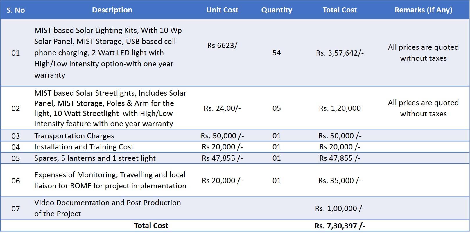 - Solar Street Lights: A few LED street lights to illuminate the nodal areas of the tribals habitat
