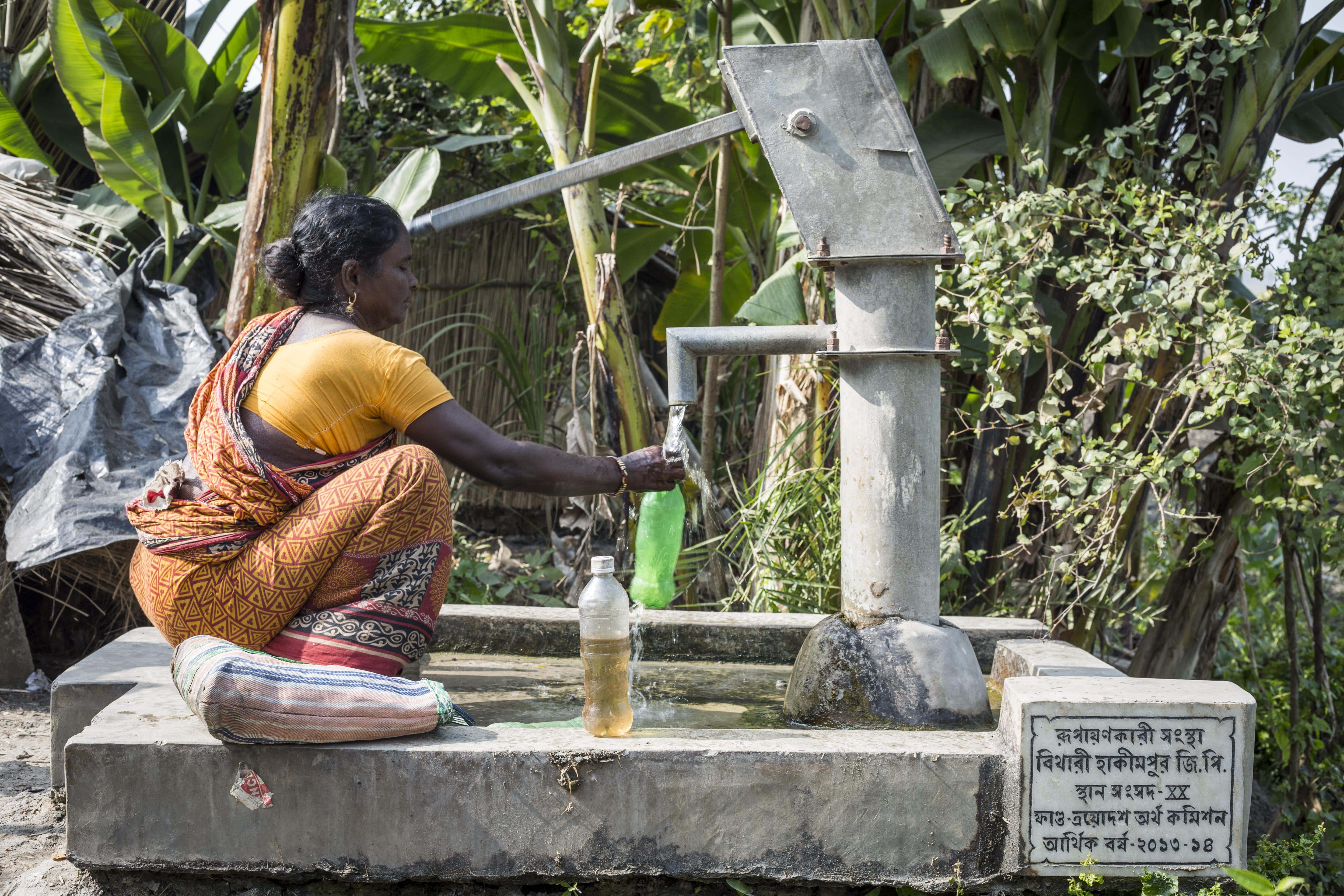 A local woman near Bithari filling contaminated ground water for drinking.