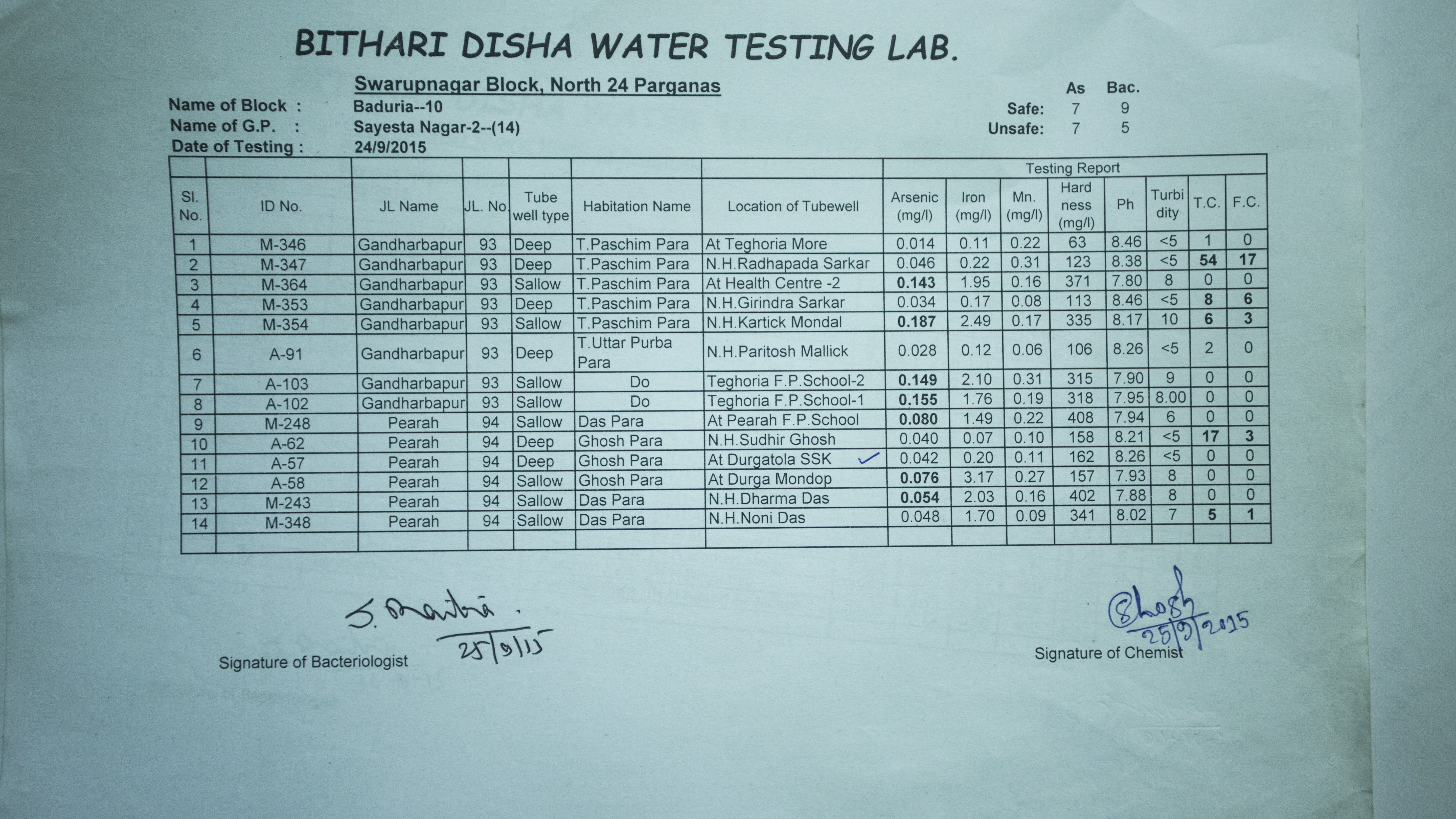In 2015 testing of 1407 borewells was carried out in Swaroop Nagar and Baduria block. Out of which 49 borewells were contaminated with dangerous levels of arsenic, 178 with iron and 47 with bacteria.